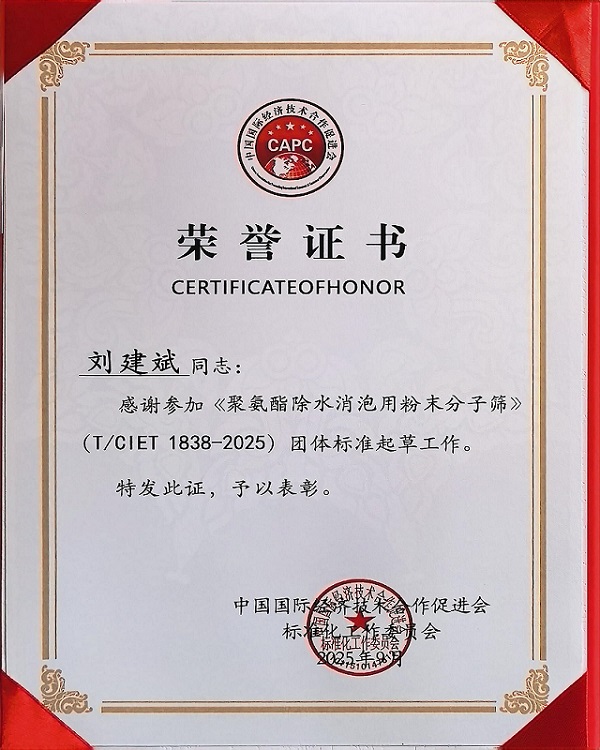 近期,由中國國際經(jīng)濟(jì)技術(shù)合作促進(jìn)會標(biāo)準(zhǔn)化工作委員會主導(dǎo)制定的《聚氨酯除水消泡用粉末分子篩》(T/CIET 1838-2025)團(tuán)體標(biāo)準(zhǔn)正式發(fā)布實施。江西鑫淘科技股份有限公司憑借在粉末分子篩領(lǐng)域的技術(shù)沉淀與行業(yè)影響力,受邀成為該標(biāo)準(zhǔn)起草單位,公司董事長劉建斌深度參與標(biāo)準(zhǔn)起草工作,為行業(yè)標(biāo)準(zhǔn)化建設(shè)貢獻(xiàn)核心力量。